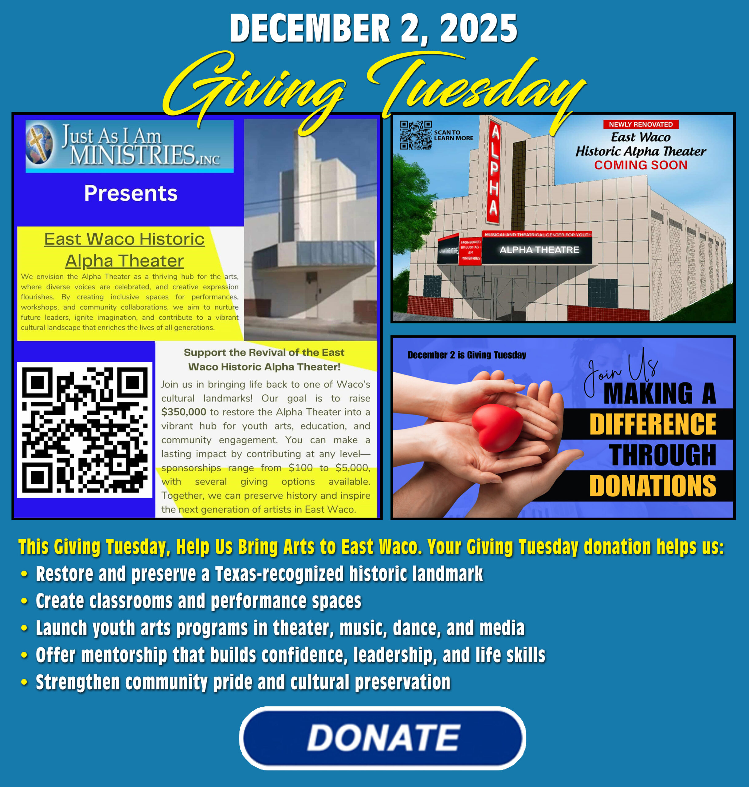 Our kids need more than football & sports. They need something that they can carry throughout life that can bring inner joy and peace! With your help we will be able to complete the RENOVATION OF THE HISTORIC ALPHA THEATER on Clifton Street in East Waco by the end of our 20th year celebration.